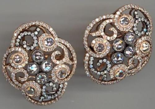 LARGE 18KT ROSE GOLD CLIP ON EARRINGS. 3D BEZEL OPEN FILIGREE FLOWER DESIGN. ROUND WHITE DIAMONDS ARE F/G COLOR, VSSI CLARITY 1.78 CARATS. ROSE CUT DIAMONDS ARE 1.46 CARATS.