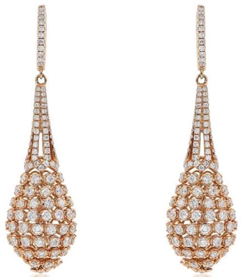 LARGE18KT ROSEGOLD FUNHANGINGEARRINGS. 3D CLUSTER TEAR DROPDESIGN. DIAMONDS ARE F/G COLOR, VSSI CLARITY 3.34 CARATS.WRITTEN APPRAISAL AVAILABLE. COMES IN A PRESENTABLE GIFT BOX.