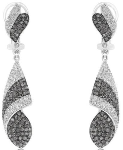 LARGE 18KT WHITE GOLD FUN HANGING EARRINGS. 3D MULTI ROW SWIRL TEAR DROP DESIGN. ROUND WHITE DIAMONDS ARE F/G COLOR, VSSI CLARITY 1.25 CARATS. ROUND BLACK DIAMONDS ARE 2.12 CARATS.