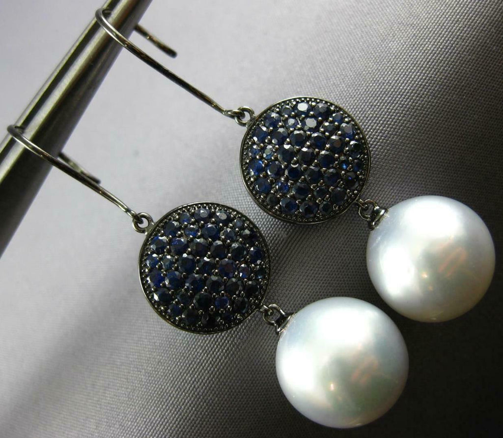 LARGE18KT BLACK GOLD HANGINGEARRINGS. 3D ROUND CLUSTERDESIGN. AAA SAPPHIRES ARE 3.60 CARATS.FEATURES AAA SOUTH SEA PEARL.MEASURES 49mm X 13mm. WRITTEN APPRAISAL AVAILABLE. COMES IN A PRESENTABLE GIFT BOX.