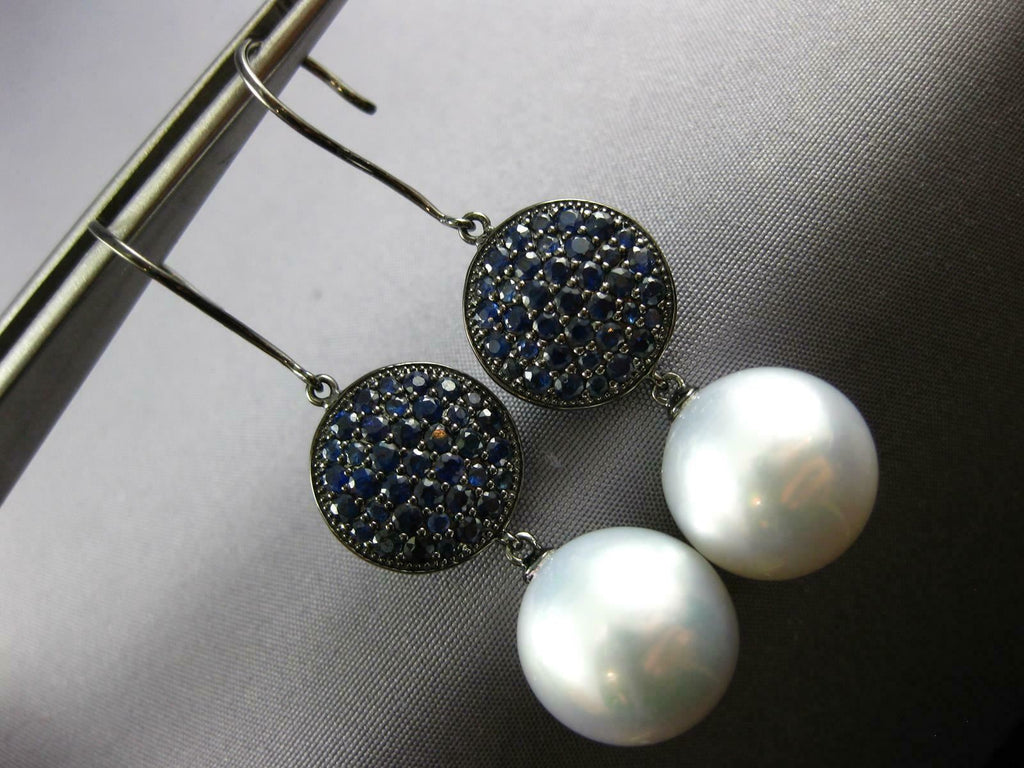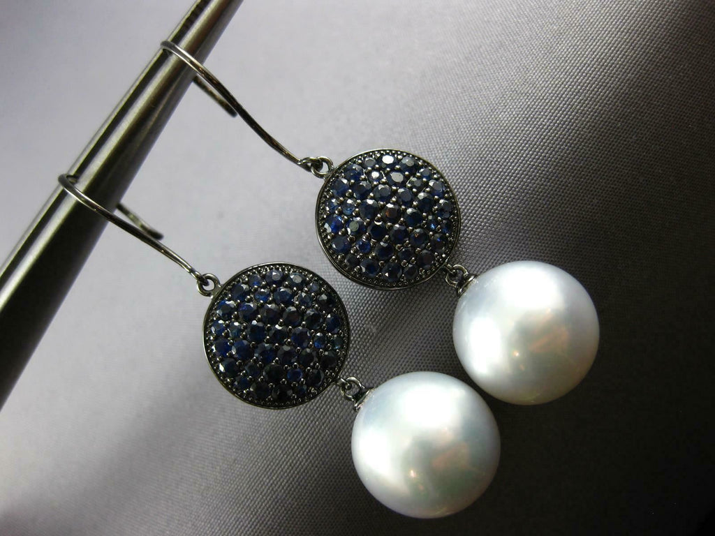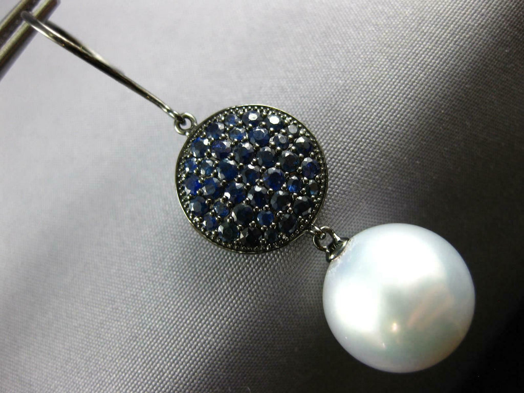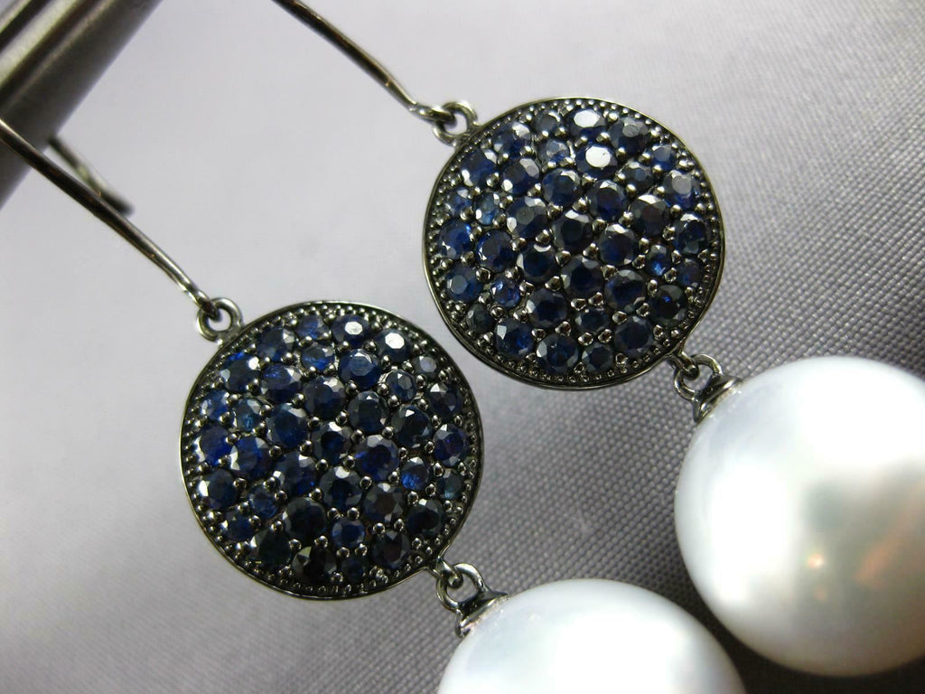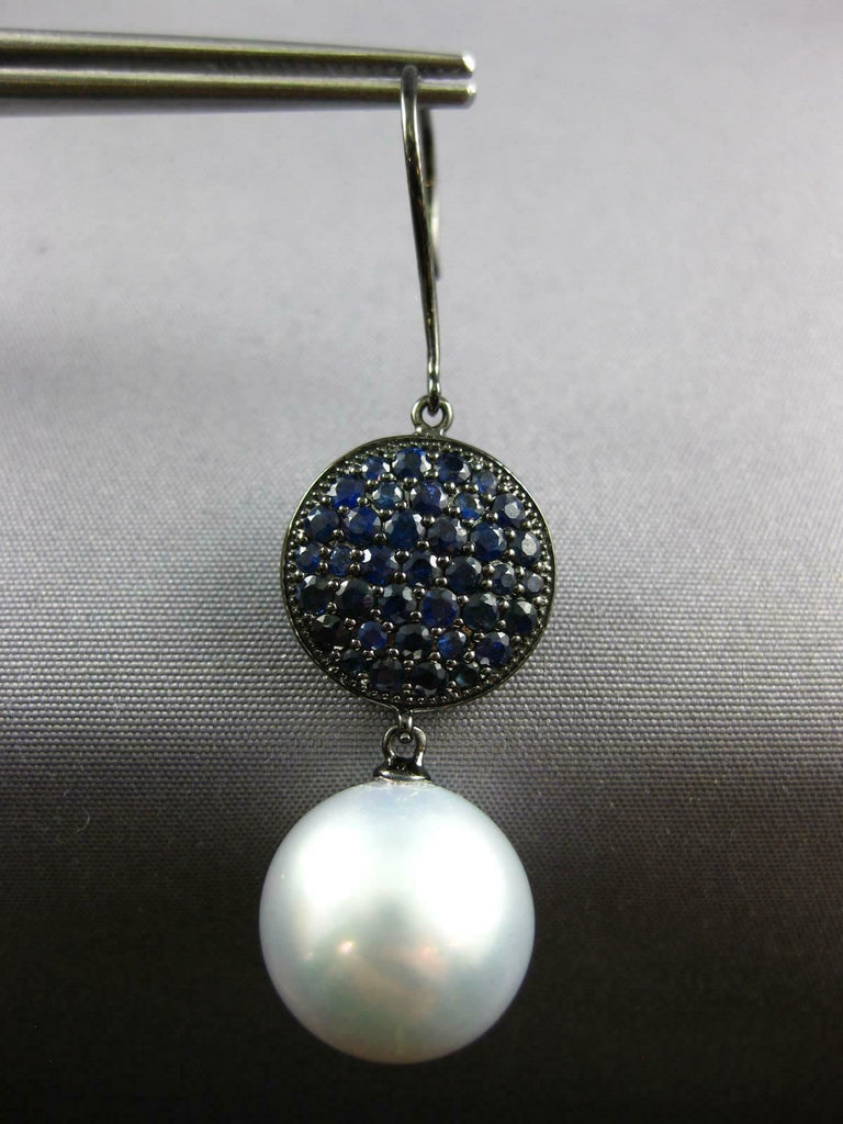 LARGE 3.60CT AAA SAPPHIRE & SOUTH SEA PEARL 18KT BLACK GOLD 3D HANGING EARRINGS