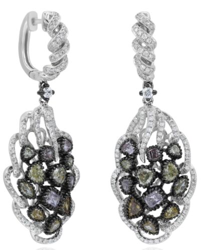 LARGE 3.61CT MULTI COLOR DIAMOND 18KT WHITE GOLD FLORAL HUGGIE HANGING EARRINGS