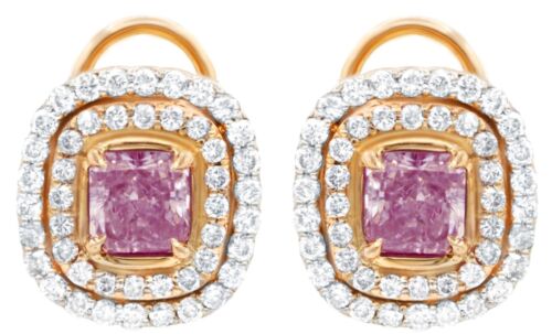 LARGE 18KT ROSE GOLD CLIP ON FUN HANGING EARRINGS. 3D DOUBLE SQUARE HALO DESIGN. WHITE DIAMONDS ARE G/H COLOR, SI CLARITY 1.8 CARATS. PINK DIAMONDS ARE 1.8 CARATS.