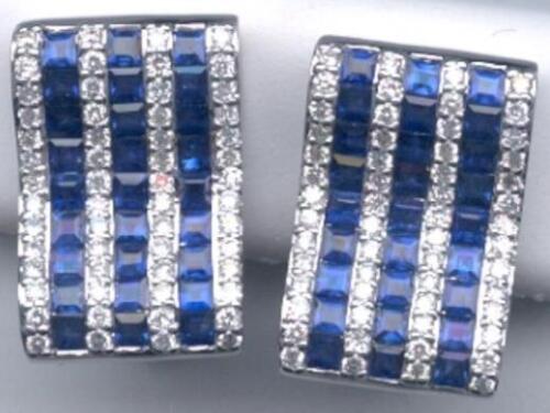 LARGE 18KT WHITE GOLD CLIP ON HANGING EARRINGS. 3D MULTI ROW SQUARE DESIGN. ROUND DIAMONDS ARE F/G COLOR, VSSI CLARITY .87 CARATS. AAA PRINCESS CUT SAPPHIRES ARE 3.04 CARATS.