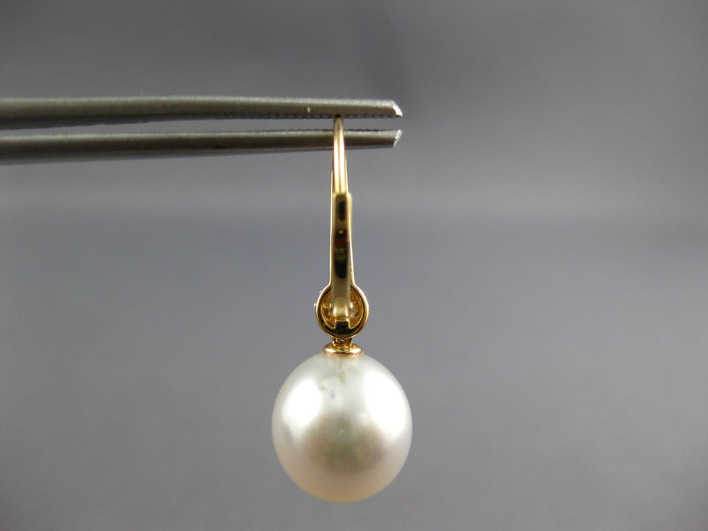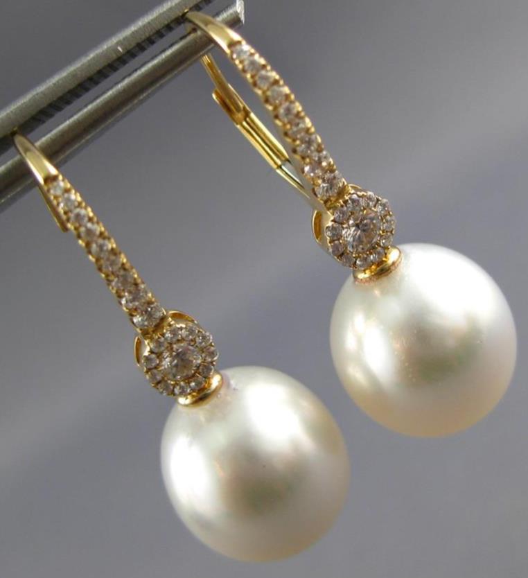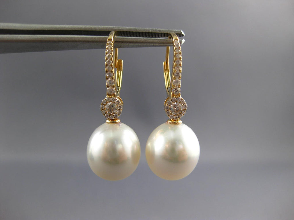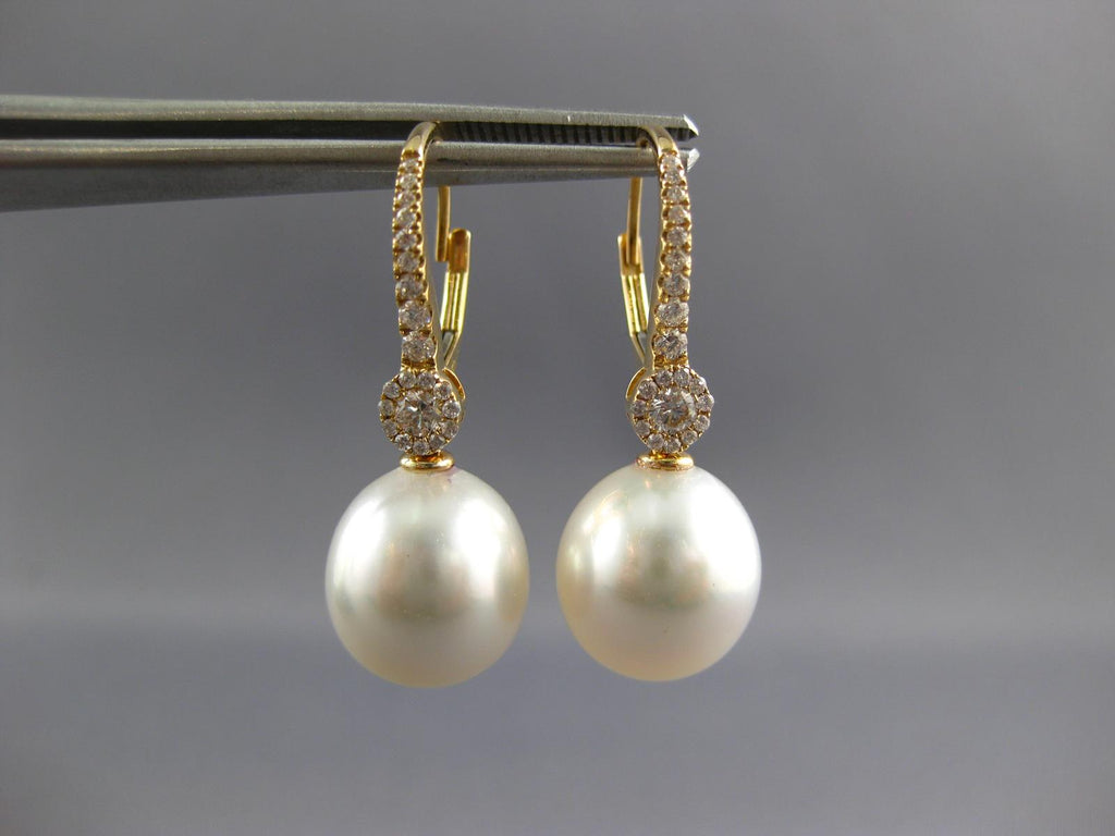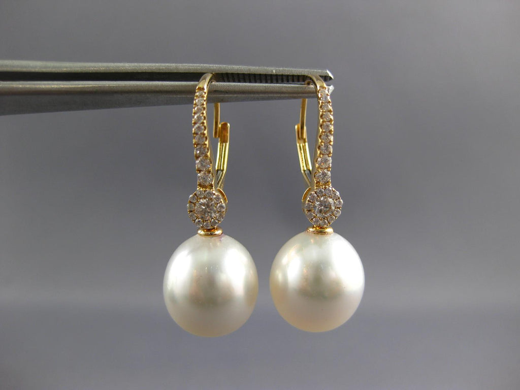 LARGE 18KT YELLOW GOLD LEVERBACK HANGING EARRINGS. 3D CLASSIC DESIGN. DIAMONDS ARE F/G COLOR, VSSI CLARITY .37 CARATS. FEATURES 13mm WIDE AAA SOUTH SEA PEARL. EARRINGS MEASURES 30mm X 11mm. WRITTEN APPRAISAL AVAILABLE. COMES IN A PRESENTABLE GIFT BOX.