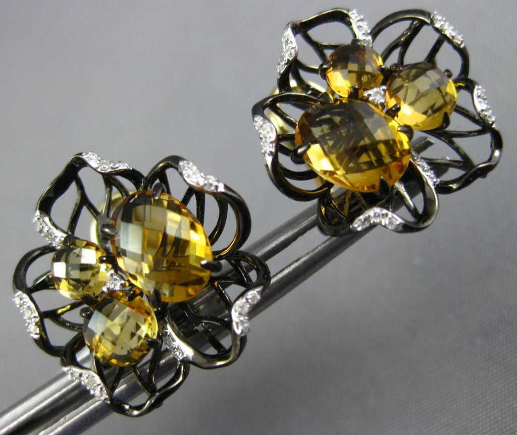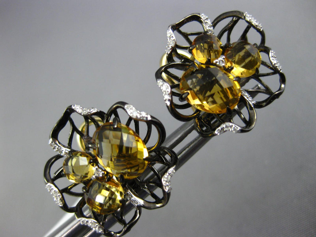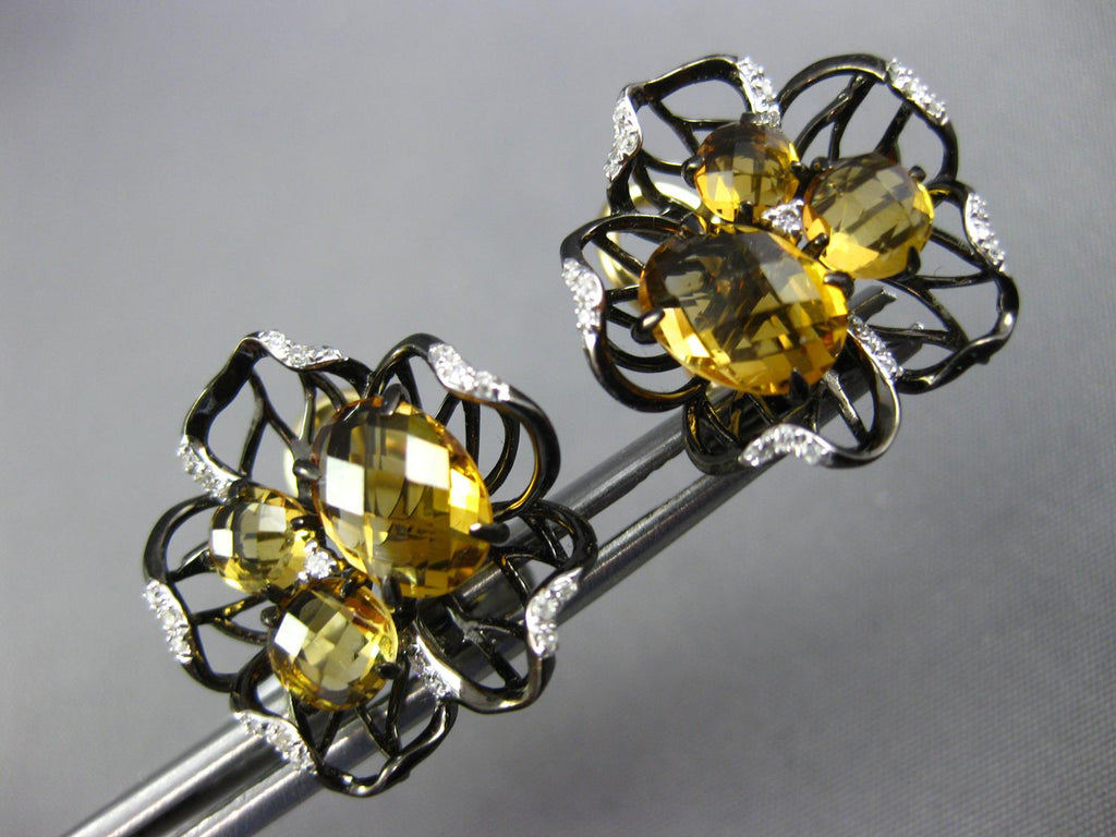 LARGE 14KT YELLOW AND BLACK GOLD CLIP ON EARRINGS. 3D FLOWER DESIGN. DIAMONDS ARE F/G COLOR, VSSI CLARITY .20 CARATS. AAA CITRINES ARE 3.60 CARATS. MEASURES 16mm WIDE. WRITTEN APPRAISAL AVAILABLE. COMES IN A PRESENTABLE GIFT BOX.
