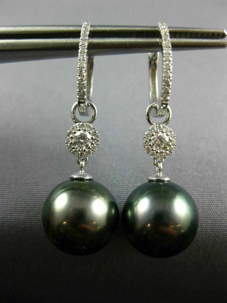 LARGE18KT WHITEGOLD HUGGIE HANGINGEARRINGS. 3D CLASSIC CLUSTER DESIGN. DIAMONDS ARE F/G COLOR, VSSI CLARITY.SMALL DIAMONDS ARE .21 CARATS. LARGE DIAMONDS ARE .17 CARATS.FEATURES AAA TAHITIANPEARLS.MEASURES 32mm X 11mm. WRITTEN APPRAISAL AVAILABLE. COMES IN A PRESENTABLE GIFT BOX.