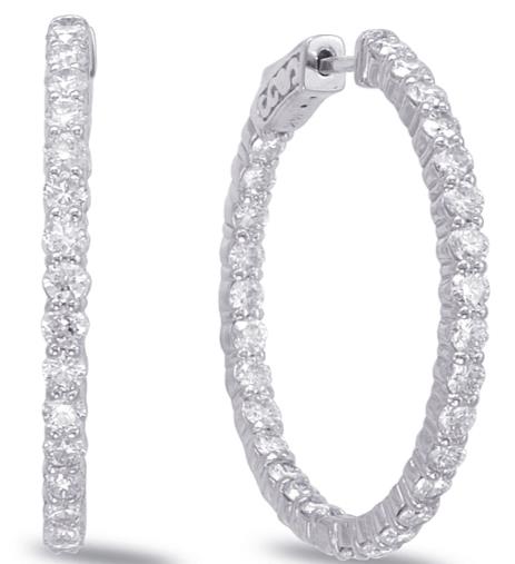 LARGE 14KT WHITE GOLD HOOP HANGING EARRINGS. 3D CLASSIC SHARED PRONG INSIDE OUT DESIGN. ROUND DIAMONDS ARE F/G COLOR, VSSI CLARITY 3.89 CARATS. MEASURES 3mm WIDE. WRITTEN APPRAISAL AVAILABLE. COMES IN A PRESENTABLE GIFT BOX.