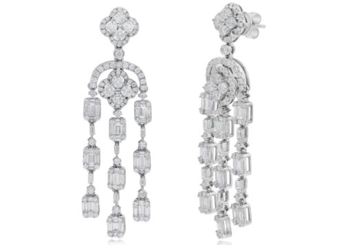 LARGE 4.20CT DIAMOND 14K WHITE GOLD ROUND & BAGUETTE CHANDELIER HANGING EARRINGS