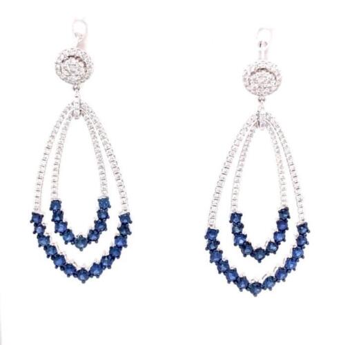 18KT WHITE GOLD HANGING EARRINGS. 3D DOUBLE TEAR DROP FLOWER DESIGN. DIAMONDS ARE F/G COLOR, VSSI CLARITY 1.37 CARATS. AAA SAPPHIRES ARE 3.34 CARATS. WRITTEN APPRAISAL AVAILABLE. COMES IN A PRESENTABLE GIFT BOX.