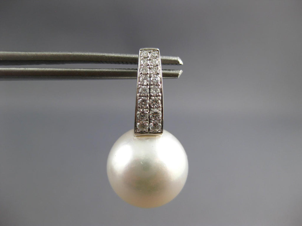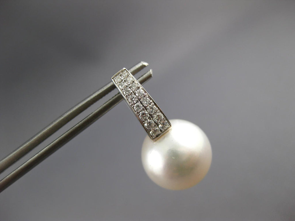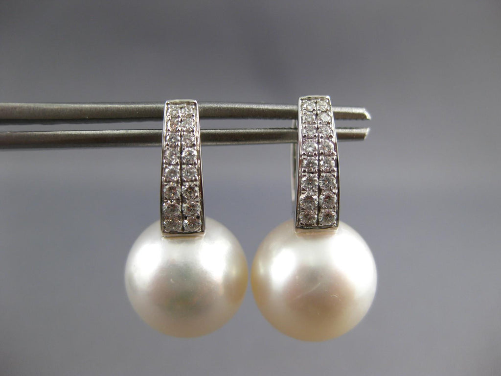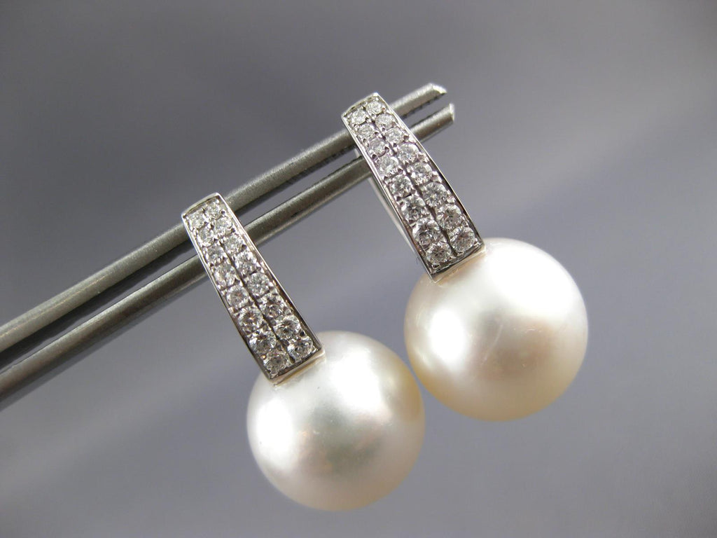 LARGE 18KT WHITE GOLD HUGGIE HANGING EARRINGS. 3D CLASSIC TWO ROW DESIGN. DIAMONDS ARE F/G COLOR, VSSI CLARITY .40 CARATS. FEATURES 13mm WIDE AAA SOUTH SEA PEARL. EARRINGS MEASURES 25mm X 13mm. WRITTEN APPRAISAL AVAILABLE. COMES IN A PRESENTABLE GIFT BOX.