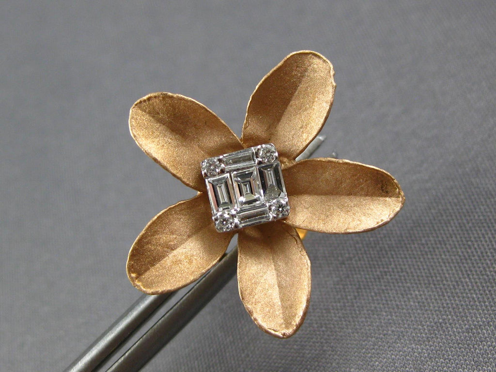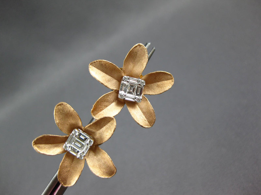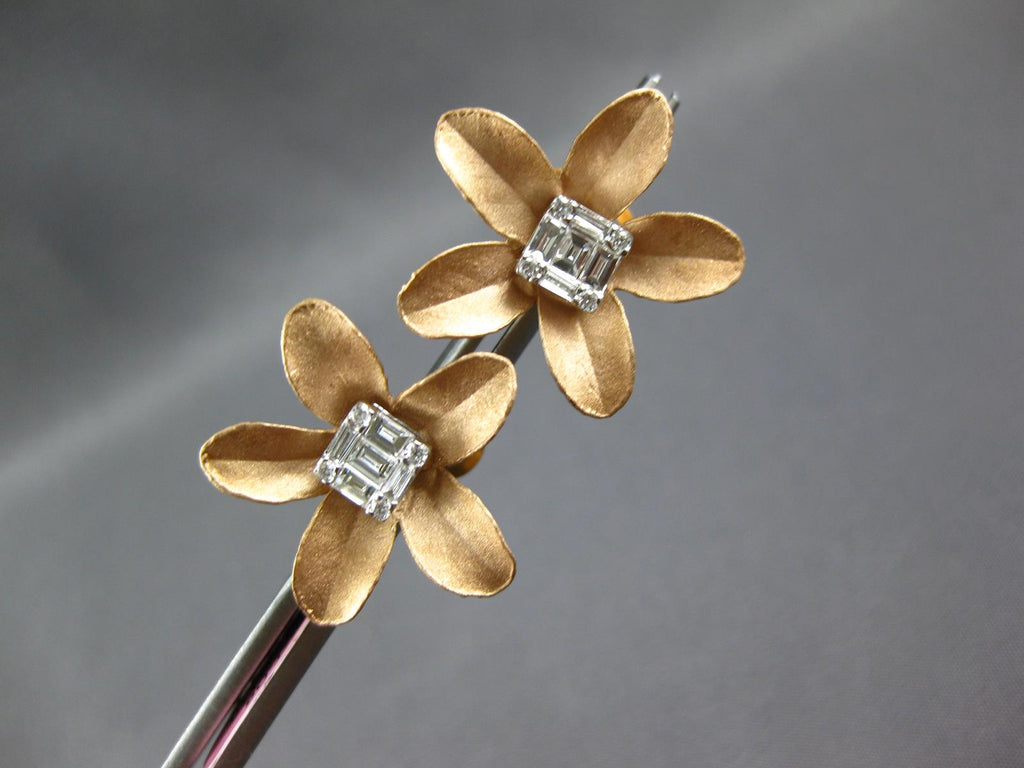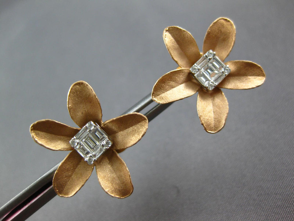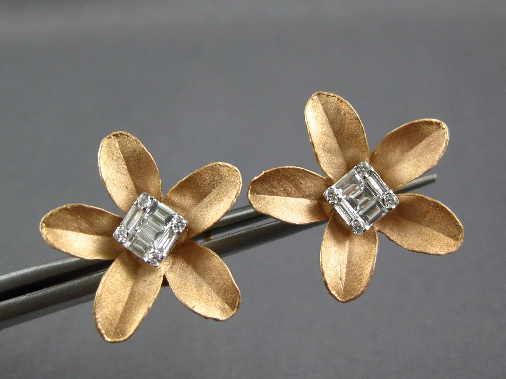 LARGE 18KT ROSE GOLD STUD EARRINGS. 3D CLUSTER FLOWER DESIGN. ROUND AND BAGUETTE DIAMONDS ARE F/G COLOR, VS CLARITY .41 CARATS. MEASURES 21mm X 21mm. WRITTEN APPRAISAL AVAILABLE. COMES IN A PRESENTABLE GIFT BOX.