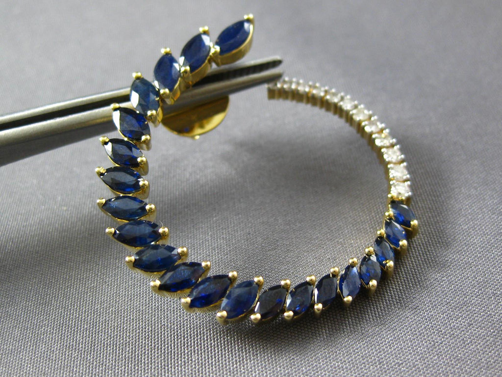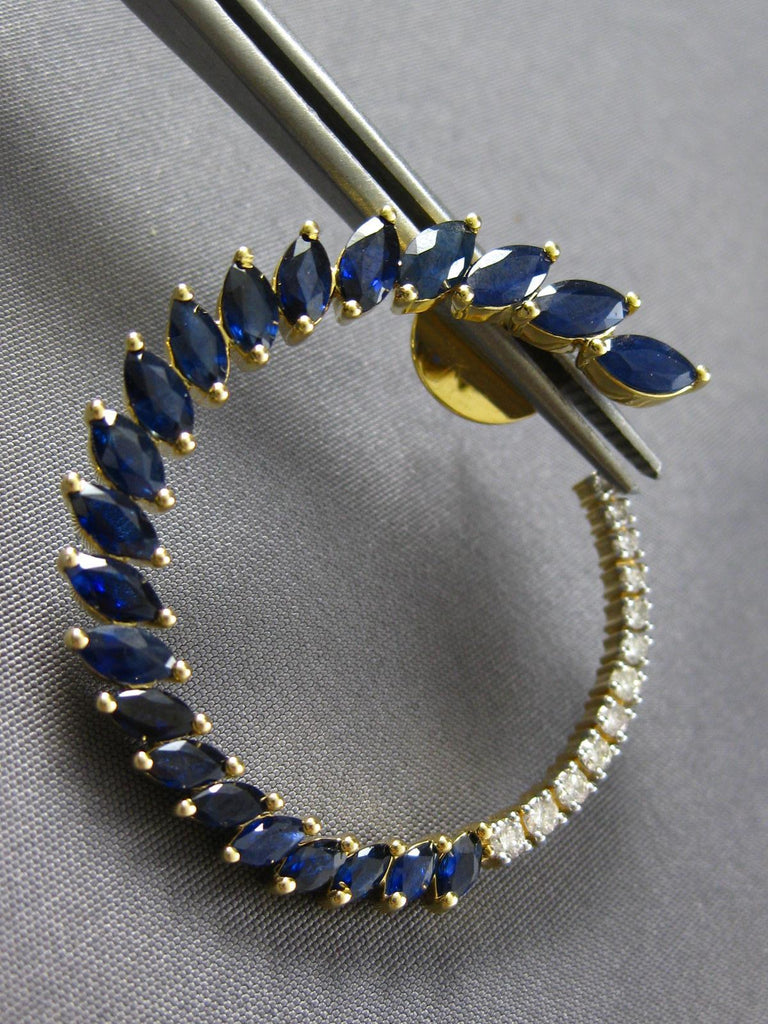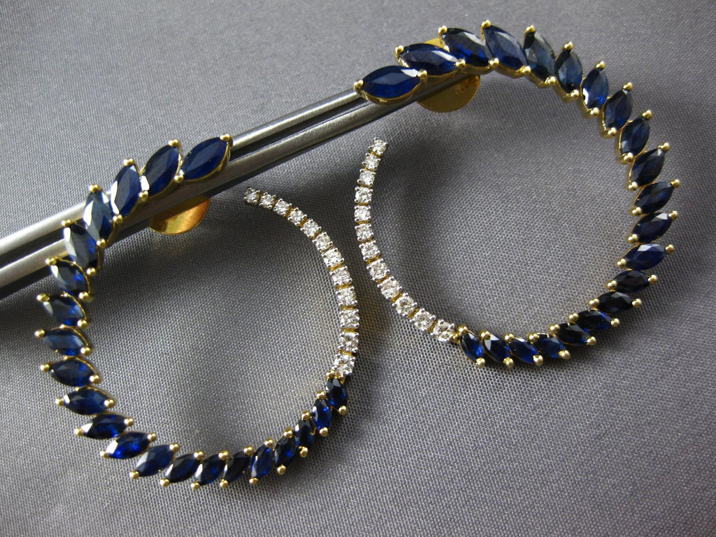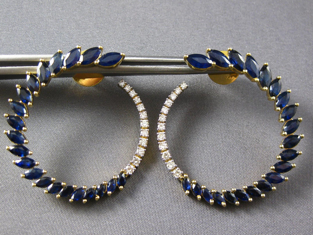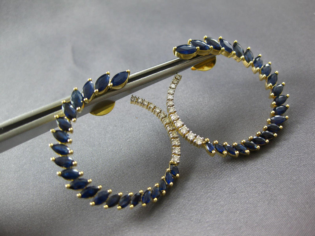 LARGE 14KT YELLOW GOLD HOOP HANGING EARRINGS. 3D SIDEWAY DESIGN. ROUND DIAMONDS ARE F/G COLOR, VSSI CLARITY .30 CARATS. AAA MARQUISE SAPPHIRES ARE 4.0 CARATS. MEASURES 34mm X 34mm. WRITTEN APPRAISAL AVAILABLE. COMES IN A PRESENTABLE GIFT BOX.