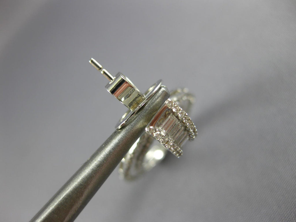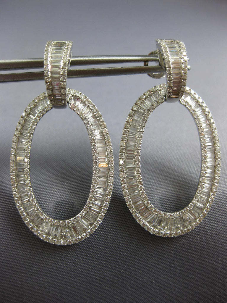 LARGE 18KT WHITE GOLD HANGING EARRINGS. 3D OPEN OVAL DESIGN. DIAMONDS ARE F/G COLOR, VSSI CLARITY. ROUND DIAMONDS ARE 1.62 CARATS. BAGUETTE DIAMONDS ARE 2.72 CARATS. MEASURES 39mm X 20mm. WRITTEN APPRAISAL AVAILABLE. COMES IN A PRESENTABLE GIFT BOX.