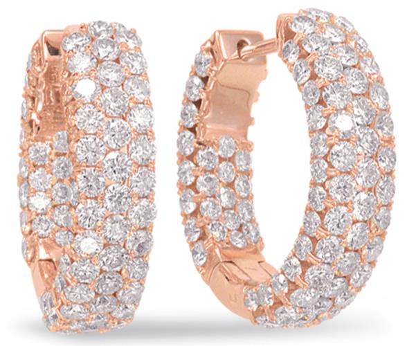 LARGE 14KT ROSE GOLD HUGGIE HOOP HANGING EARRINGS. 3D MULTI ROW INSIDE OUT DESIGN. DIAMONDS ARE F/G COLOR, VSSI CLARITY 4.49 CARATS. MEASURES 6mm WIDE. WRITTEN APPRAISAL AVAILABLE. COMES IN A PRESENTABLE GIFT BOX.