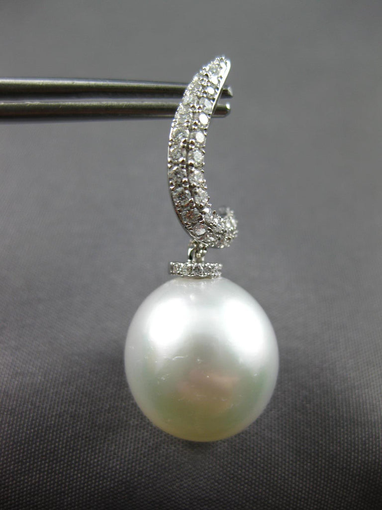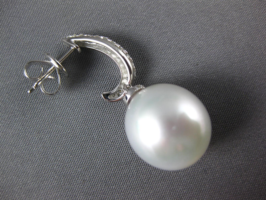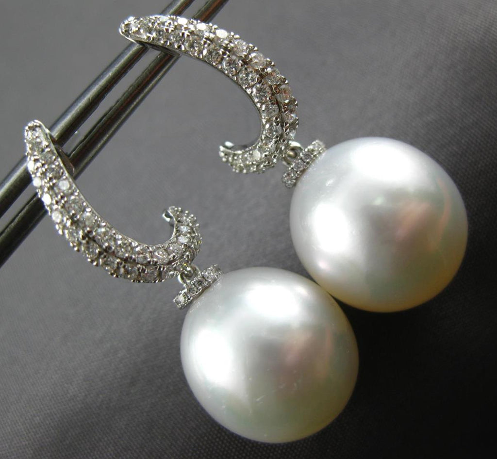 LARGE 18KT WHITE GOLD HANGING EARRINGS. 3D SWIRL DESIGN. DIAMONDS ARE F/G COLOR, VSSI CLARITY .48 CARATS. FEATURES 13mm WIDE AAA SOUTH SEA PEARLS. EARRINGS MEASURE 30mm X 13mm. WRITTEN APPRAISAL AVAILABLE. COMES IN A PRESENTABLE GIFT BOX.