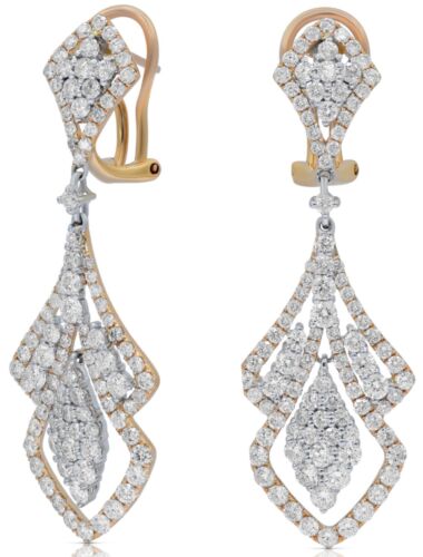 LARGE 18KT WHITE AND ROSE GOLD CLIP ON FUN HANGING EARRINGS. 3D FLORAL DOUBLE TEAR DROP DESIGN. ROUND DIAMONDS ARE F/G COLOR, VSSI CLARITY 5.17 CARATS.