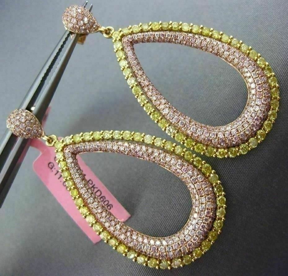 LARGE 18KT YELLOW & ROSE GOLD HANGING EARRINGS. 3D TEAR DROP DESIGN. PINK DIAMONDS ARE 3.01 CARATS. FANCY YELLOW DIAMONDS ARE 2.15 CARATS. MEASURES 47MM X 23MM. WRITTEN APPRAISAL AVAILABLE. COMES IN A PRESENTABLE GIFT BOX.