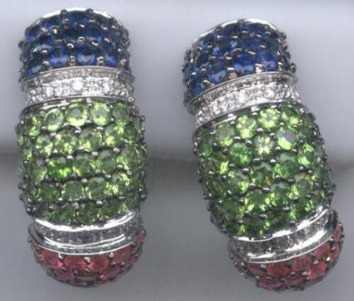 LARGE 14KT WHITE GOLD CLIP ON HANGING EARRINGS. 3D DESIGN. DIAMONDS ARE F/G COLOR, VSSI CLARITY .16 CARATS. AAA MULTI COLOR SAPPHIRES ARE 5.17 CARATS. WRITTEN APPRAISAL AVAILABLE. COMES IN A PRESENTABLE GIFT BOX.