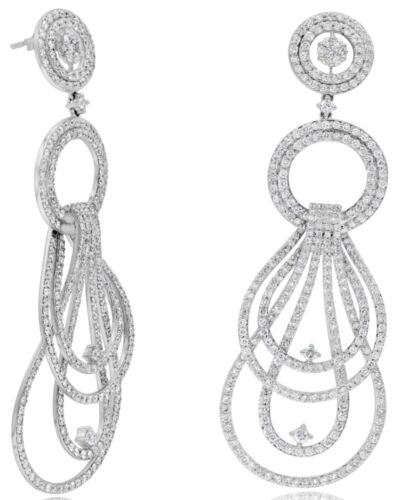 LARGE 18KT WHITE GOLD HANGING EARRINGS. 3D MULTI ROW LOVE KNOT CIRCULAR TEAR DROP CHANDELIER DESIGN. ROUND DIAMONDS ARE F/G COLOR, VSSI CLARITY 5.35 CARATS. WRITTEN APPRAISAL AVAILABLE. COMES IN A PRESENTABLE GIFT BOX.