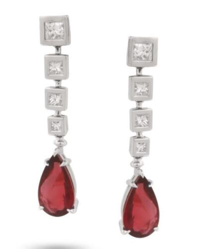 LARGE 5.35CT DIAMOND & AAA RUBY 18K WHITE GOLD PEAR SHAPE BEZEL HANGING EARRINGS