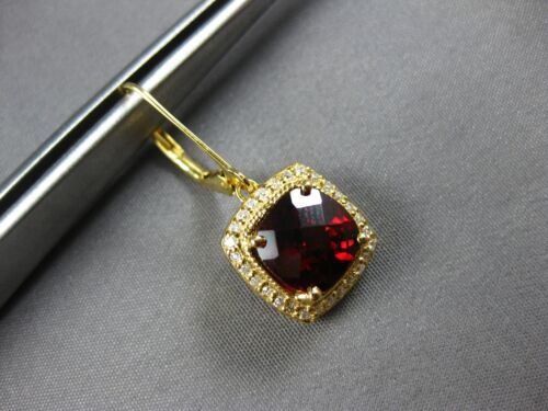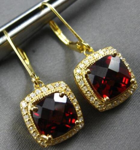 LARGE 14KT YELLOW GOLD LEVERBACK HANGING EARRINGS. 3D SQUARE HALO DESIGN. ROUND DIAMONDS ARE F/G COLOR, VSSI CLARITY .36 CARATS. AAA EXTRA FACETED CUSHION CUT GARNET IS 5.25 CARATS. MEASURES 28mm X 11.5mm. WRITTEN APPRAISAL AVAILABLE. COMES IN A PRESENTABLE GIFT BOX.