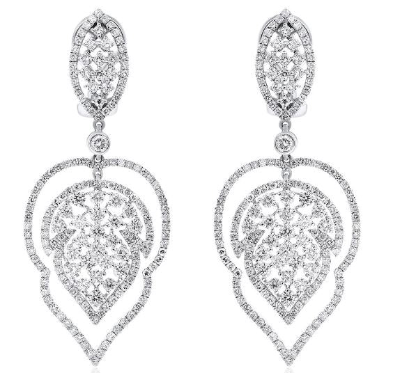 LARGE 18KT WHITEGOLDHANGINGEARRINGS. 3DOPEN FILIGREELEAFDESIGN. DIAMONDS ARE F/G COLOR, VSSI CLARITY 5.70CARATS. WRITTEN APPRAISAL AVAILABLE. COMES IN A PRESENTABLE GIFT BOX.