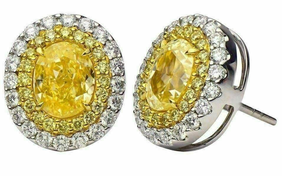 LARGE 5.71CT WHITE & FANCY YELLOW DIAMOND 18KT TWO TONE GOLD OVAL STUD EARRINGS