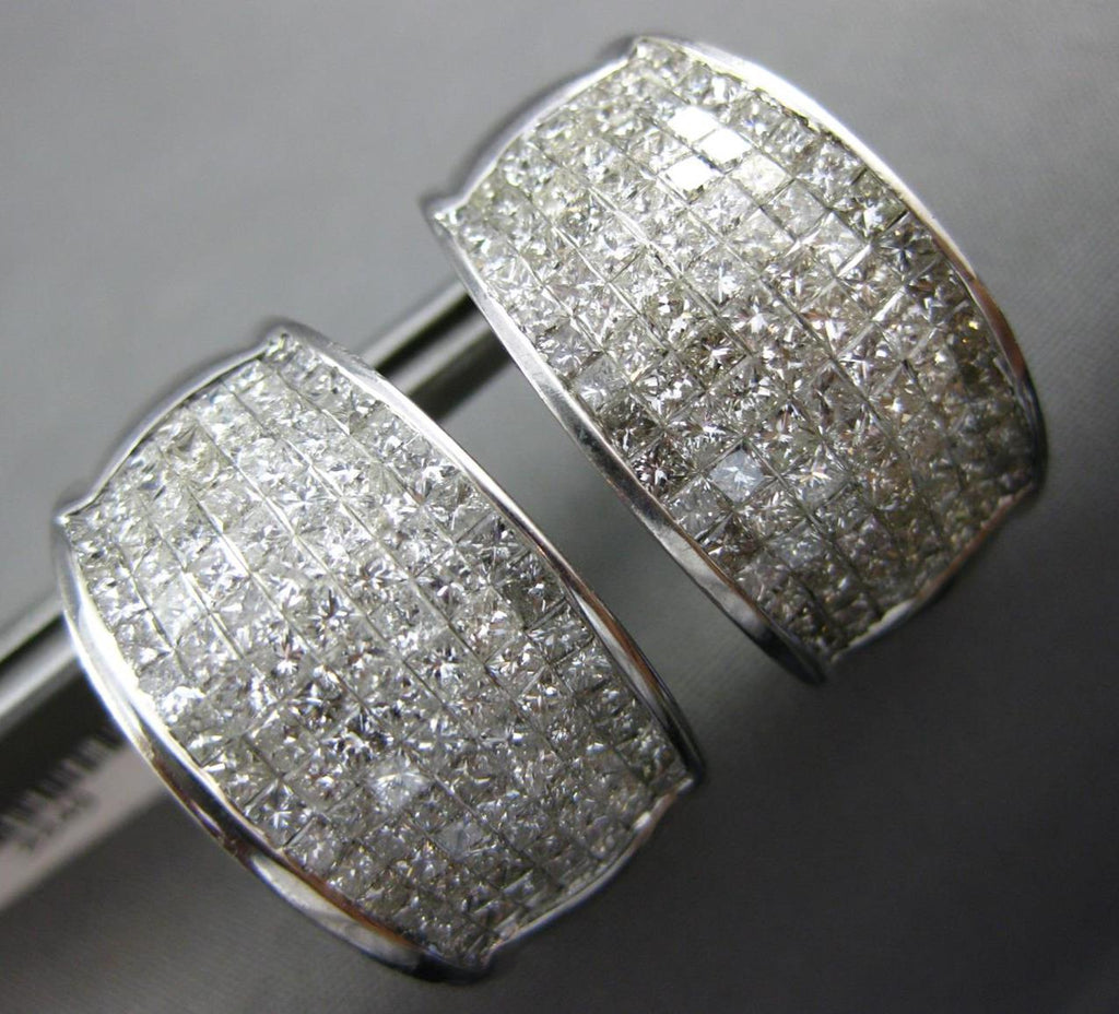 LARGE 14KT WHITE GOLD CLIP ON HANGING EARRINGS. 3D MULTI ROW INVISIBLE DESIGN. PRINCESS CUT DIAMONDS ARE F/G COLOR, VSSI CLARITY 5.81 CARATS. MEASURES 24.5mm X 13.5mm. WRITTEN APPRAISAL AVAILABLE. COMES IN A PRESENTABLE GIFT BOX.