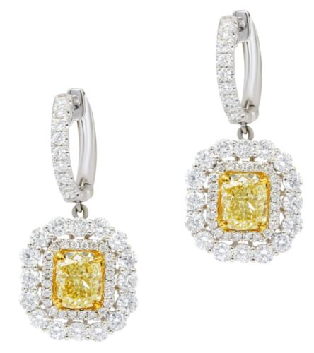 LARGE 18KT WHITE AND YELLOW GOLD HANGING EARRINGS. 3D DOUBLE HALO SQUARE FLORAL DESIGN. ROUND WHITE DIAMONDS ARE G/H COLOR, VSSI CLARITY 3.0 CARATS. CUSHION CUT FANCY YELLOW DIAMONDS ARE 3.03 CARATS. WRITTEN APPRAISAL AVAILABLE. COMES IN A PRESENTABLE GIFT BOX.