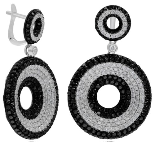 LARGE 18KT WHITE GOLD FUN HANGING EARRINGS. 3D MULTI ROW DOUBLE CIRCULAR DESIGN. ROUND WHITE DIAMONDS ARE F/G COLOR, VSSI CLARITY 2.40 CARATS. ROUND BLACK DIAMONDS ARE 4.30 CARATS.