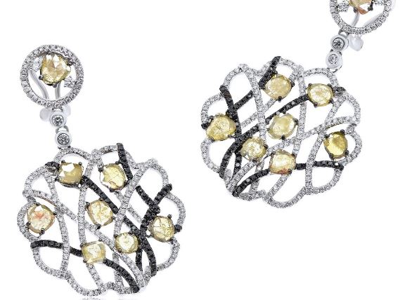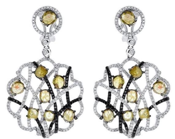 LARGE 6.85CT MULTI COLOR DIAMOND 18KT WHITE & BLACK GOLD FLOWER HANGING EARRINGS