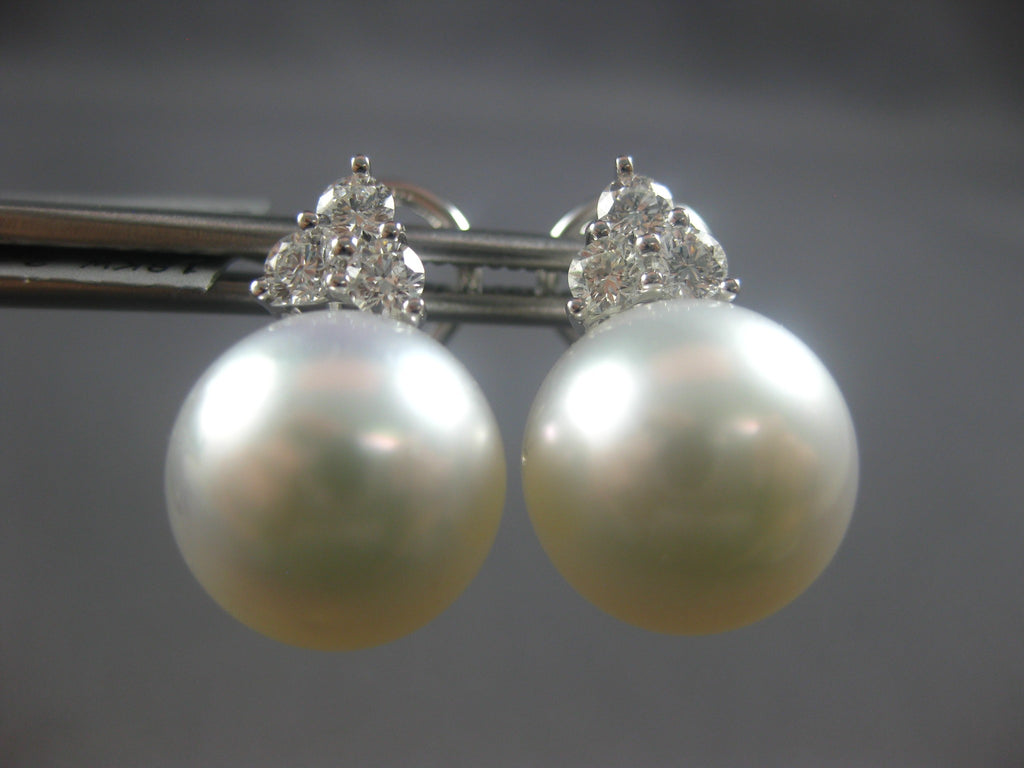 LARGE 18KT WHITE GOLD CLIP ON STUD EARRINGS. 3D TRIANGULAR DESIGN. DIAMONDS ARE  F/G COLOR, VSSI CLARITY .60 CARATS. FEATURES AAA SOUTH SEA PEARL. PEARLS MEASURE 12mm WIDE. EARRINGS MEASURE 18mm X 12mm. WRITTEN APPRAISAL AVAILABLE. COMES IN A PRESENTABLE GIFT BOX.