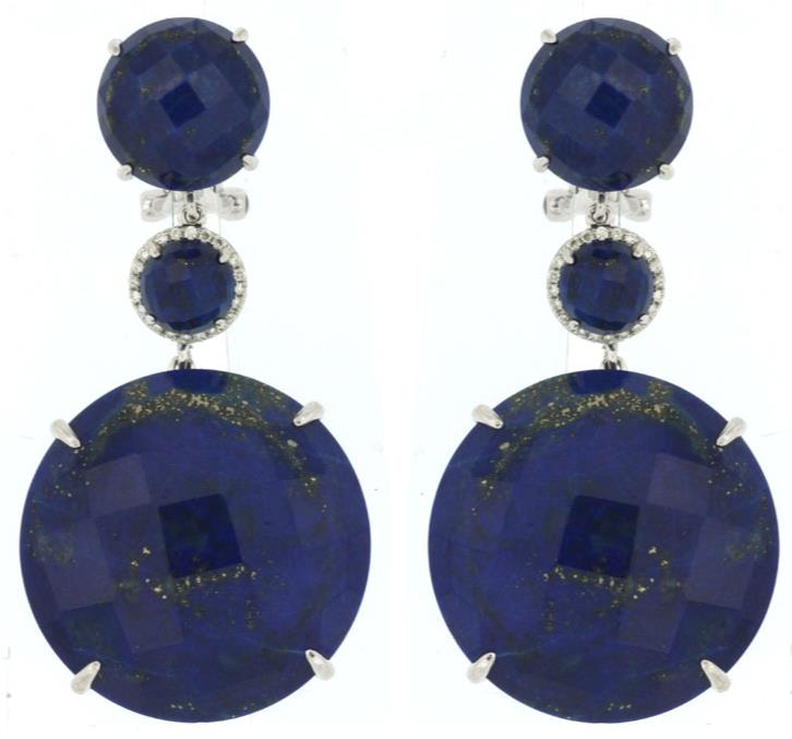 LARGE 14KT WHITE GOLD HANGING EARRINGS. 3D CIRCULAR DESIGN. DIAMONDS ARE F/G COLOR, VSSI CLARITY .11 CARATS. AAA EXTRA FACETED LAPIS ARE 66.0 CARATS. WRITTEN APPRAISAL AVAILABLE. COMES IN A PRESENTABLE GIFT BOX.