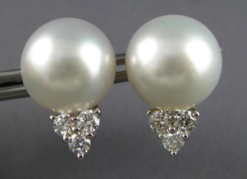LARGE 18KT WHITE GOLD STUD EARRINGS. 3D THREE STONE TRIANGULAR DESIGN. ROUND DIAMONDS ARE F/G COLOR, VSSI CLARITY .60 CARATS. AAA SOUTH SEA PEARLS MEASURE 13mm WIDE. EARRINGS MEASURE 19mm X 13mm. WRITTEN APPRAISAL AVAILABLE. COMES IN A PRESENTABLE GIFT BOX.