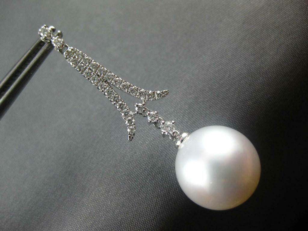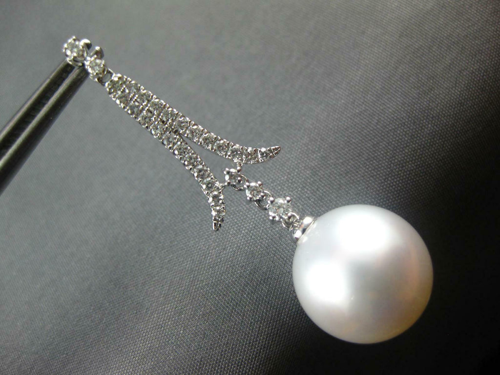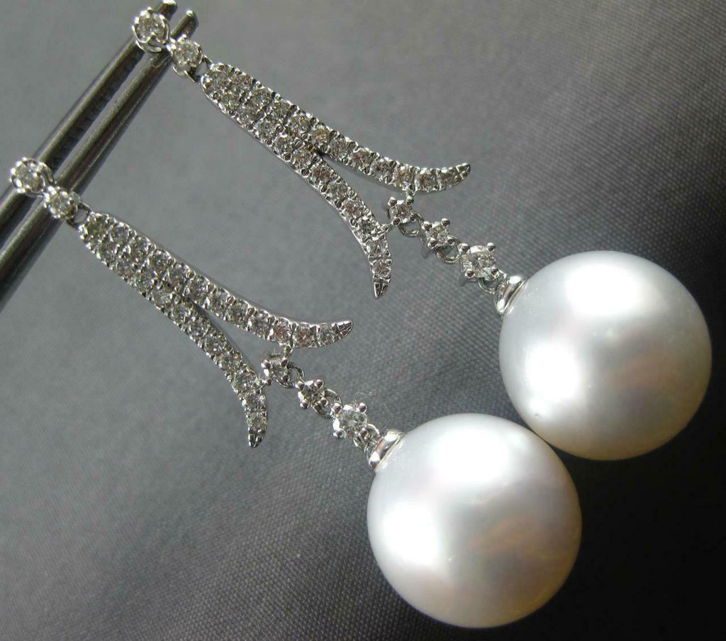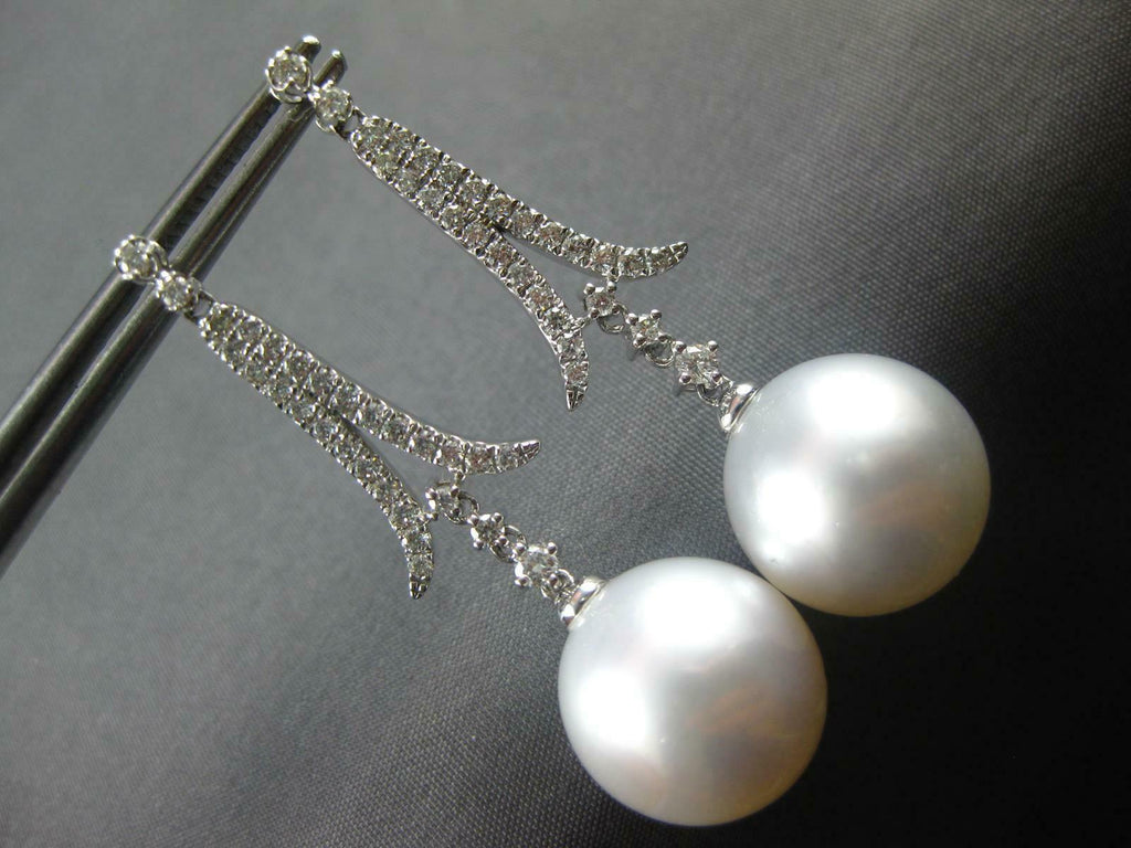 LARGE 18KT WHITE GOLD HANGING EARRINGS. 3D V SHAPE CHANDELIER DESIGN. DIAMONDS ARE F/G COLOR, VSSI CLARITY .60 CARATS. FEATURES 12.5MM WIDE AAA SOUTH SEA PEARLS. EARRINGS MEASURE 12.5MM X 42.5MM. WRITTEN APPRAISAL AVAILABLE. COMES IN A PRESENTABLE GIFT BOX.