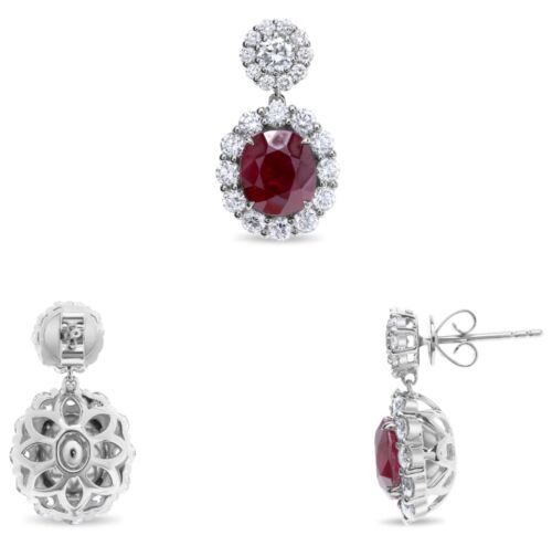 LARGE 7.02CT DIAMOND & AAA RUBY 18KT WHITE GOLD 3D OVAL & ROUND HANGING EARRINGS
