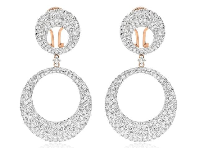 LARGE 14KT ROSE GOLD FUNHANGINGEARRINGS. 3D MULTI ROW CIRCULAR PAVEDESIGN. DIAMONDS ARE F/G COLOR, VSSI CLARITY 7.08CARATS.WRITTEN APPRAISAL AVAILABLE. COMES IN A PRESENTABLE GIFT BOX.