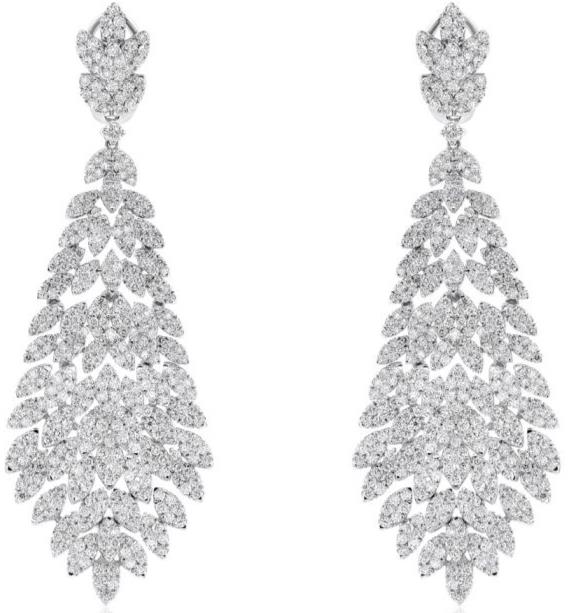 LARGE 18KT WHITE GOLD HANGING EARRINGS. 3D CLUSTER FLOWER LEAF DESIGN. DIAMONDS ARE F/G COLOR, VSSI CLARITY 7.39 CARATS. WRITTEN APPRAISAL AVAILABLE. COMES IN A PRESENTABLE GIFT BOX.