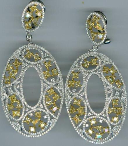 LARGE 18KT WHITE AND YELLOW GOLD CLIP ON HANGING EARRINGS. 3D CLUSTER OVAL DESIGN. ROUND WHITE DIAMONDS ARE F/G COLOR, VSSI CLARITY 2.99 CARATS. ROUND FANCY YELLOW DIAMONDS ARE 4.92 CARATS. WRITTEN APPRAISAL AVAILABLE. COMES IN A PRESENTABLE GIFT BOX.
