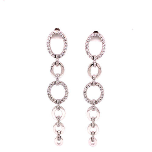 LARGE 18KT WHITE GOLD FUN HANGING EARRINGS. 3D MULTI CIRCULAR GRADUATING DESIGN. DIAMONDS ARE F/G COLOR, VSSI CLARITY .73 CARATS. WRITTEN APPRAISAL AVAILABLE. COMES IN A PRESENTABLE GIFT BOX.