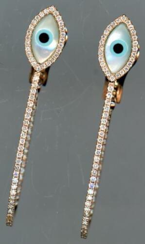 LARGE 14KT ROSE GOLD HANGING EARRINGS. 3D LUCKY EVIL EYE INSIDE OUT OVAL DESIGN. ROUND DIAMONDS ARE F/G COLOR, VSSI CLARITY .75 CARATS. FEATURES AAA MOTHER OF PEARLS.