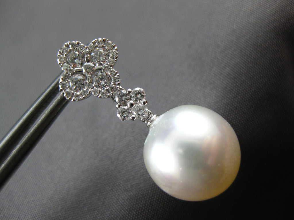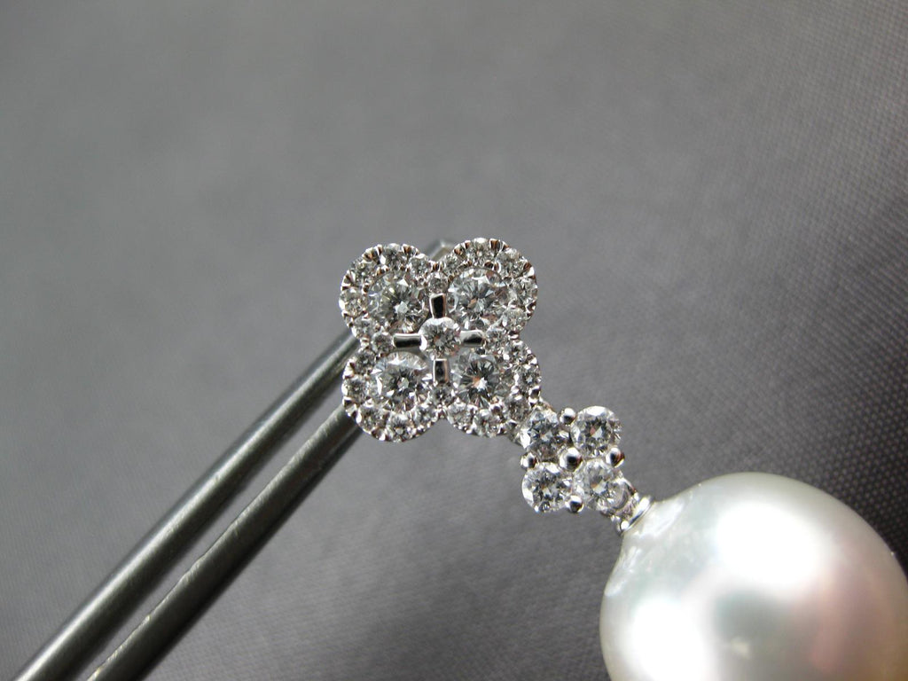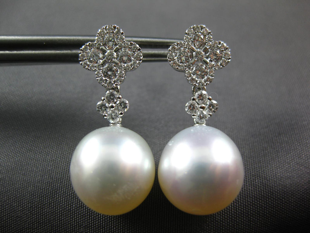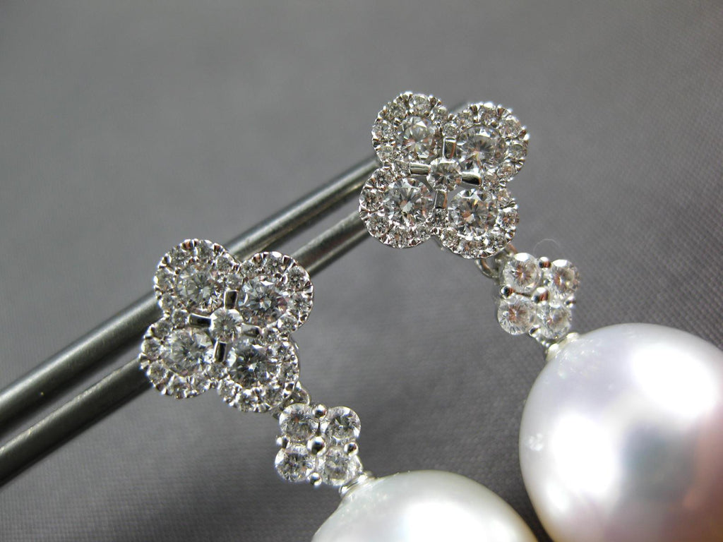 LARGE 18KT WHITE GOLD HANGING EARRINGS. 3D FOUR LEAF CLOVER FLOWER DESIGN. DIAMONDS ARE F/G COLOR, VSSI CLARITY .77 CARATS. FEATURES 11mm WIDE AAA SOUTH SEA PEARLS. EARRINGS MEASURES 26mm X 11mm. WRITTEN APPRAISAL AVAILABLE. COMES IN A PRESENTABLE GIFT BOX.