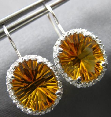 LARGE 14KT WHITE GOLD LEVERBACK HANGING EARRINGS. 3D CLASSIC HALO FILIGREE DESIGN. ROUND DIAMONDS ARE F/G COLOR, VSSI CLARITY .40 CARATS. AAA EXTRA FACETED OVAL CITRINES ARE 8.10 CARATS. MEASURES 25mm X 13mm. WRITTEN APPRAISAL AVAILABLE. COMES IN A PRESENTABLE GIFT BOX.