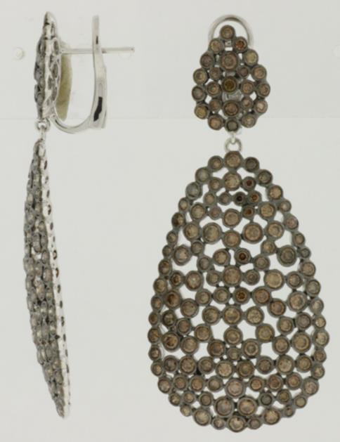 LARGE 14KT WHITE GOLD HANGING EARRINGS. 3D CLUSTER ETOILE BEZEL TEAR DROP CLIP ON DESIGN. MOCHA DIAMONDS ARE 8.50 CARATS. WRITTEN APPRAISAL AVAILABLE. COMES IN A PRESENTABLE GIFT BOX.