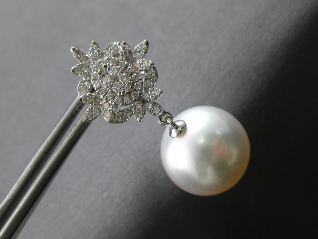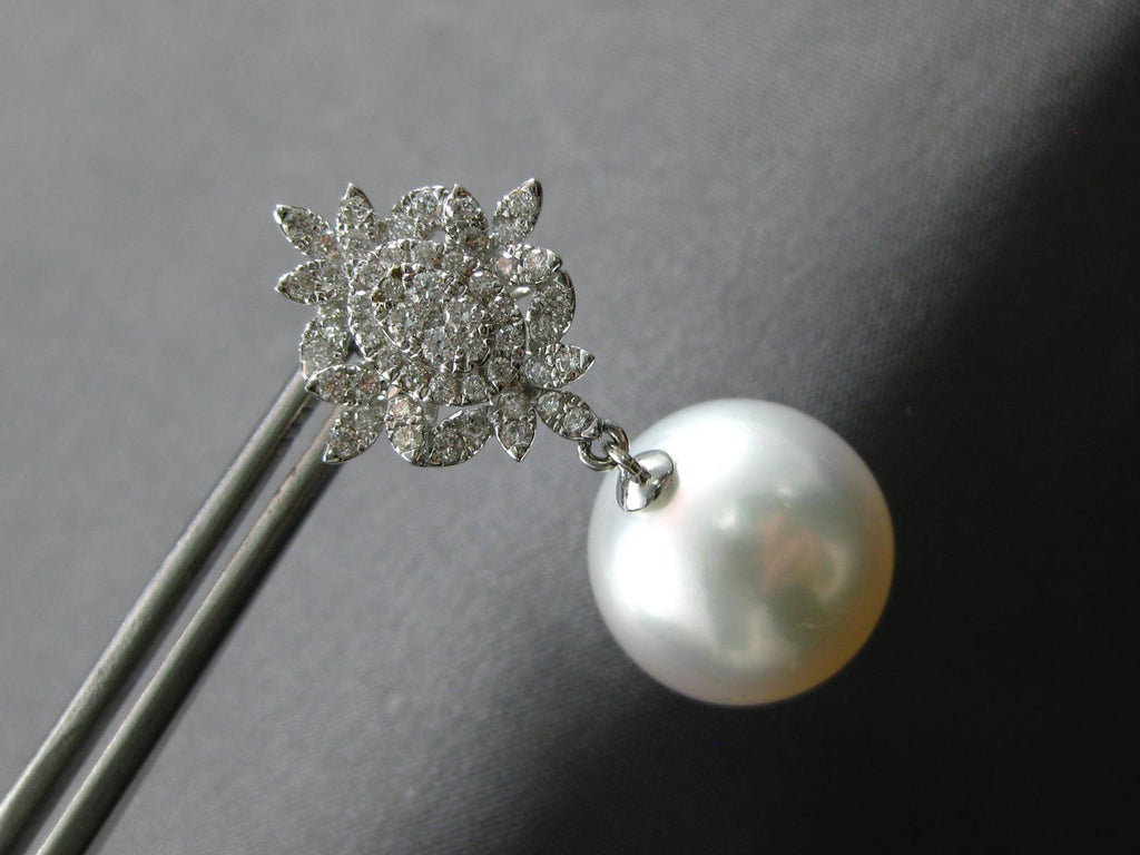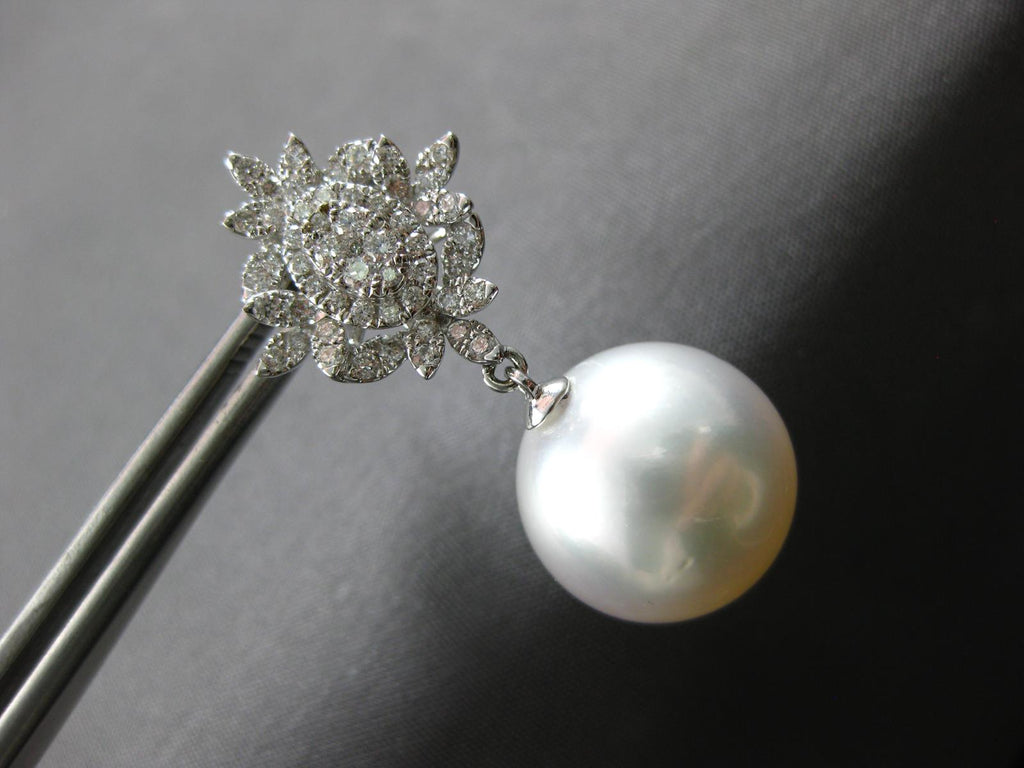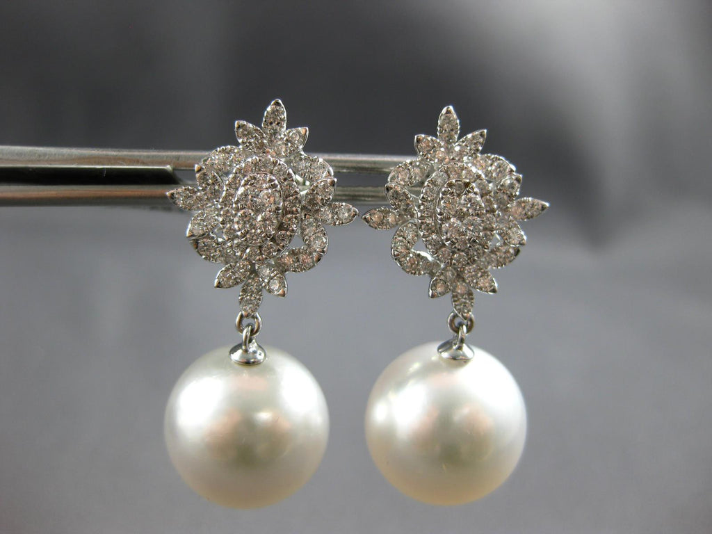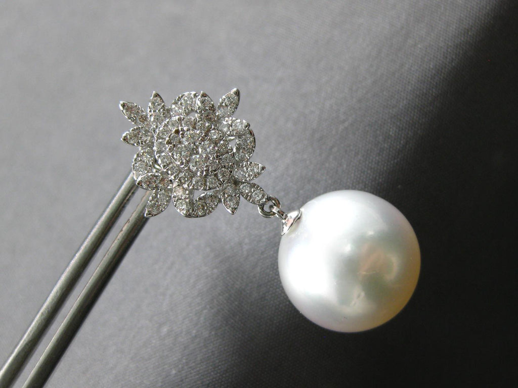 LARGE .80CT DIAMOND & AAA SOUTH SEA PEARL 18K WHITE GOLD FLORAL HANGING EARRINGS