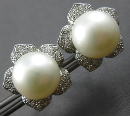 LARGE 18KT WHITE GOLD CLIP ON HANGING EARRINGS. 3D FLOWER DESIGN. DIAMONDS ARE F/G COLOR, VSSI CLARITY .80 CARATS. FEATURES AAA 13.5MM SOUTH SEA PEARLS. MEASURES 20mm WIDE. WRITTEN APPRAISAL AVAILABLE. COMES IN A PRESENTABLE GIFT BOX.