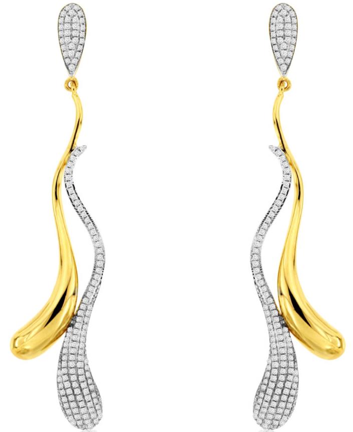 LARGE 14KT WHITE AND YELLOW GOLD HANGING EARRINGS. 3D MULTI WAVE TEAR DROP DESIGN. DIAMONDS ARE F/G COLOR, VSSI CLARITY .82 CARATS. WRITTEN APPRAISAL AVAILABLE. COMES IN A PRESENTABLE GIFT BOX.