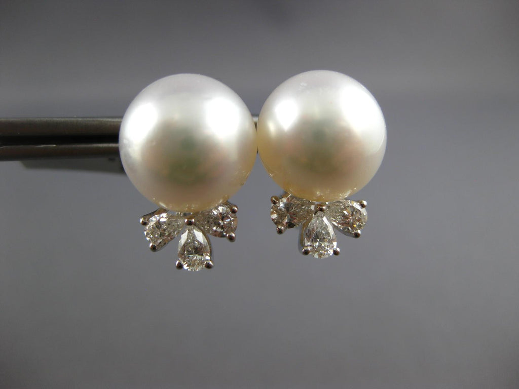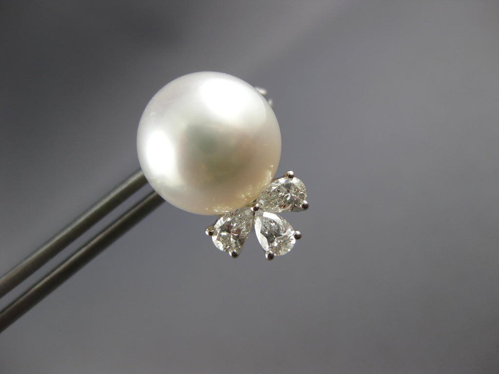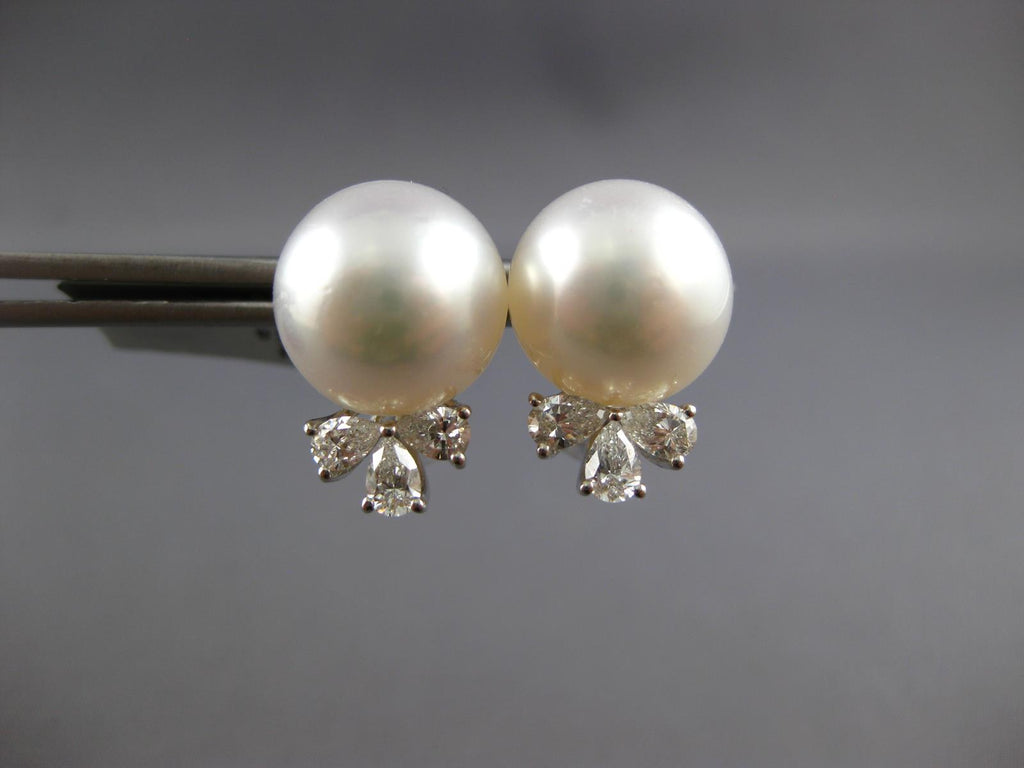 LARGE 18KT WHITE GOLD CLIP ON HANGING EARRINGS. 3D FLORAL DESIGN. PEAR SHAPE DIAMONDS ARE F/G COLOR, VSSI CLARITY .85 CARATS. FEATURES 13mm WIDE AAA SOUTH SEA PEARL. EARRINGS MEASURES 18mm X 13mm. WRITTEN APPRAISAL AVAILABLE. COMES IN A PRESENTABLE GIFT BOX.