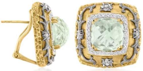 14KT YELLOW GOLD CLIP ON EARRINGS. 3D FILIGREE SQUARE DESIGN. ROUND DIAMONDS ARE F/G COLOR, VSSI CLARITY .41 CARATS. AAA EXTRA FACETED CUSHION CUT GREEN AMETHYSTS ARE 9.11 CARATS.